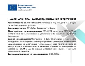 • ОУ “Любен Каравелов” гр.Бургас ще разполага с модерен СТЕМ кабинет съгласно Процедура № BG-RRP-1.015-1151,- “Училищна STEM среда” по Националния план за възстановяване и устойчивост на Република България, финансиран от Европейския съюз